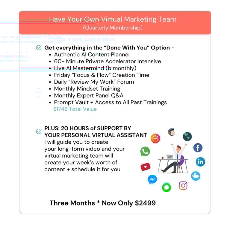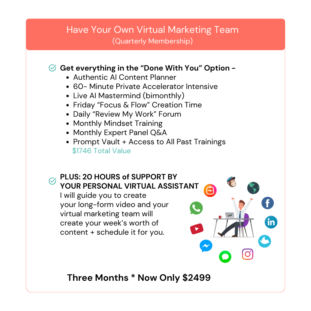 You'll develop your own Authentic Marketing Blueprint that will inform all your online marketing -- everything from website and social media, to email marketing and beyond. Plus, you'll have more fun (and time) because you'll be harnessing the power of AI to save hours each and every week.