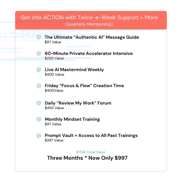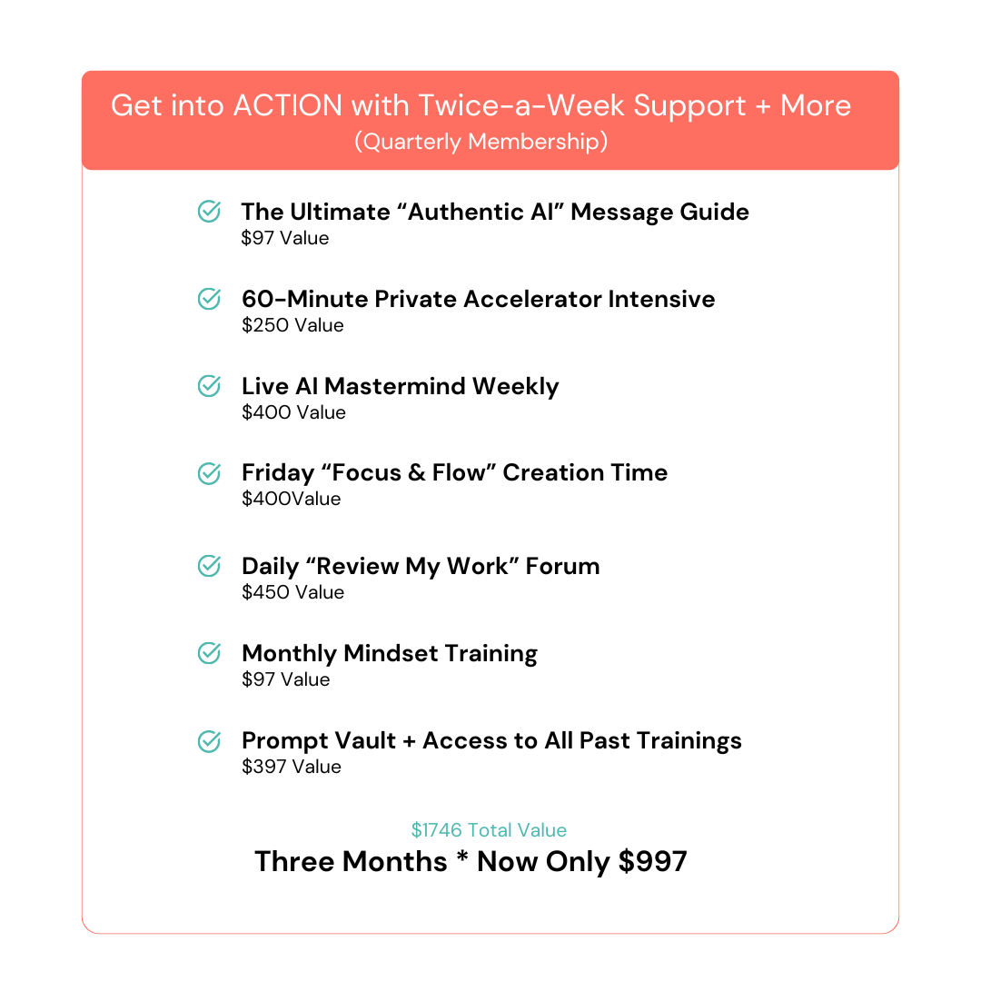 GETTING STARTED: As soon as you sign up you'll receive the The Ultimate "Authentic AI" Message Guide with the prompts you need. In just 45 minutes it will walk you through step-by-step to nail your ideal client avatar's deepest fears, challenges and aspirations.